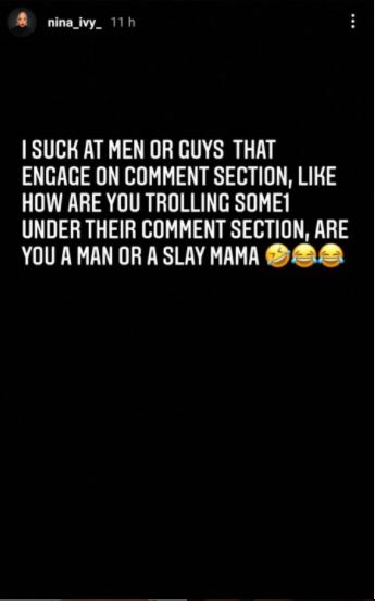 In the post shared on her Instagram story, Nini expressed displeasure at men who trolls celebrities on their comment section.
