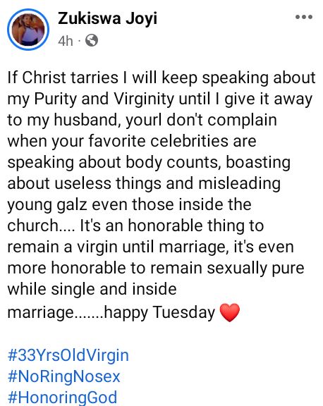 “You all don’t complain when your favorite celebrities are speaking about body counts, boasting about useless things and misleading young galz even those inside the church…. It’s an honorable thing to remain a virgin until marriage, it’s even more honorable to remain sexually pure while single and inside marriage…….happy Tuesday. #33YrsOldVirgin #NoRingNosex #HonoringGod.
