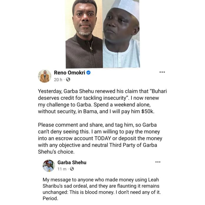 “Having said that, the current issue is not about Leah Sharibu. The issue is that you said, “Buhari deserves credit for tackling insecurity”. If you really believe what you said, Garba, then I challenge you to go to Bama in Borno, for a weekend, alone, without security. And I will pay you $50,000.