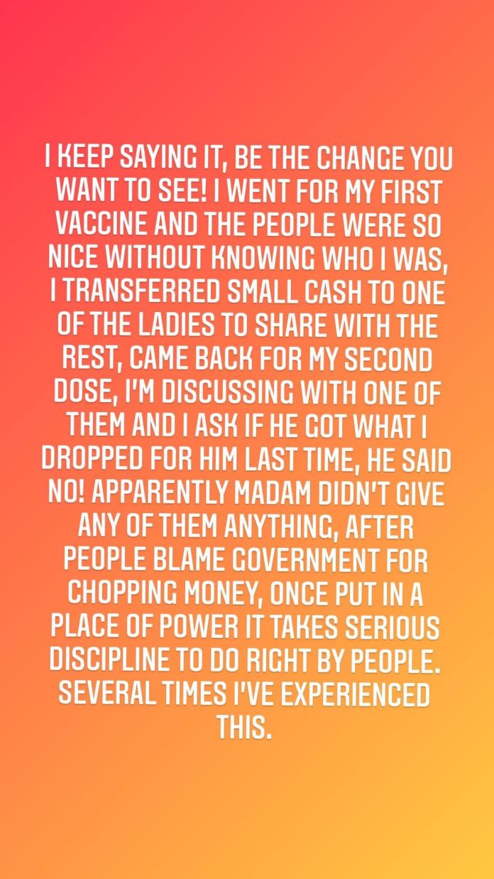 The TV star shared her experience at a vaccination centre that she was treated very well by the staff without even knowing her as a public figure and she was impressed with them that she decided to dash them a small amount of money to be shared amongst the staff. Lucy explained that she returned for her second dose today she asked from a staff who revealed that he didn’t get anything from his superiors.