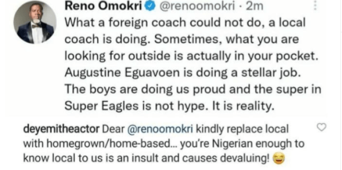 The social commentator in his post shared that a local coach is doing what Gernot Rohr, a foreign coach, could not do during his time. Reno added that sometimes what people are looking for outside is actually in the pocket and commended the Super Eagle for making Nigerians proud.