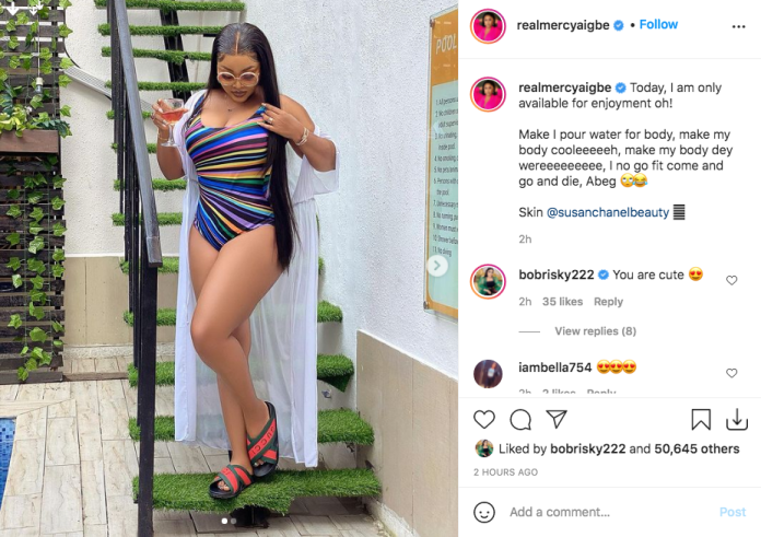 Mercy Aigbe is out on the gram tensioning and pressing hard on necks as she goes swimming today. The sexy mama of two in a post shared on her page said she is all about enjoying herself today as she goes swimming flaunting her risque figure in sexy multi-colored swimwear.