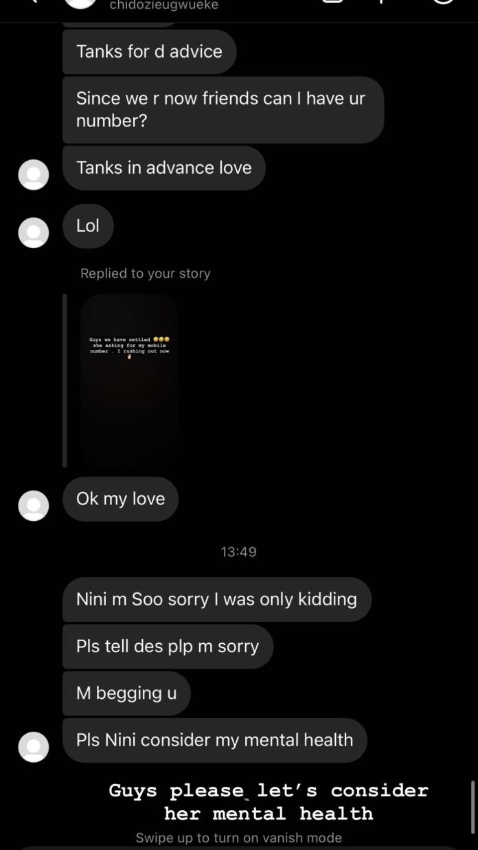 The troll shared that he will dump her soon and move on. Nini however gave the troll a subtle reply. She stated that even her leg chain money will change the life of the troll. Nini eventually shared the message the troll sent to her revealing that she only trolled her as a way to get her attention and she would want to have her number so they could be friends. Fans of the BBNaija star also didn’t spare the troll as they came hard at her and she cried out complaining about her mental health.