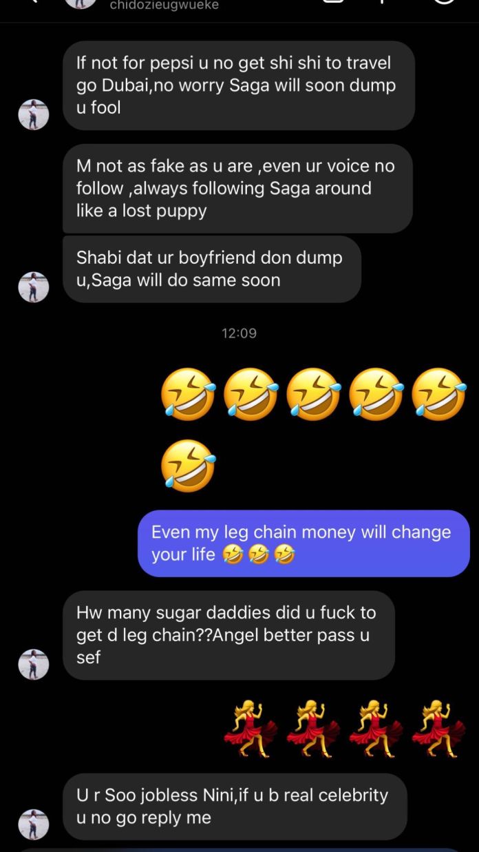 BBNaija Nini is not here for the troll and she is serving them a dose of their own medicine. A troll came into her dm and berated her that she doesn’t have money to afford the Dubai trip. The troll said that if not for Pepsi Nigeria, the reality tv star can’t afford Dubai vacation and only follows Saga her love interest in the house like a lost puppy.