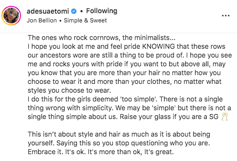Taking to social media Adesua Etomi-Wellington stated that she rocks cornrows nowadays because she feels like her most authentic self. The mother of one also stated that she is holding it down for the simple girls out there.