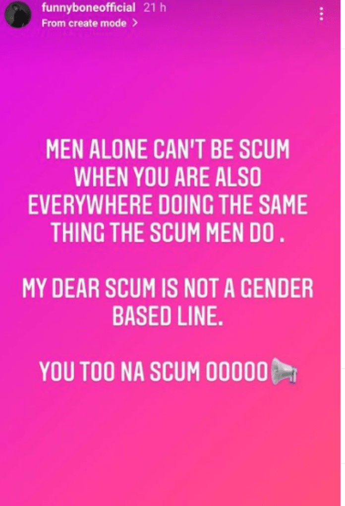 Comedian Funny Bone has come out to address women who are quick to say ‘men are scum’. The comedian took to his Instagram story to drop his two cents on the issue sharing that scum is not a gender-based line as everyone is guilty of the same things.