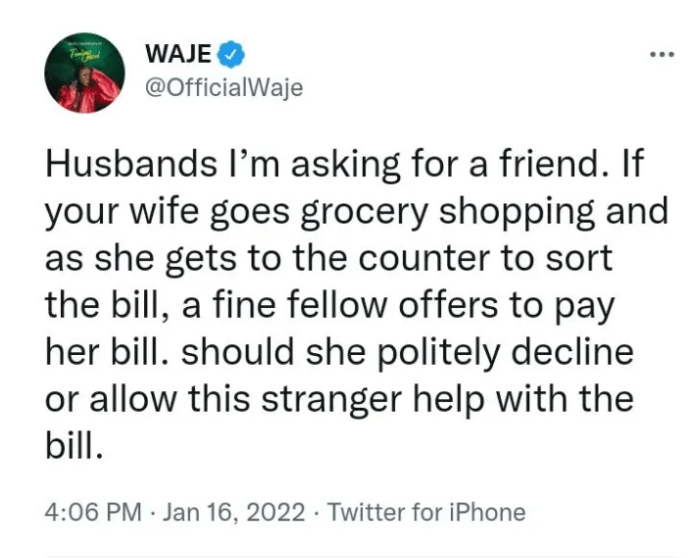 The stunning beauty asked men particularly husbands if they would be comfortable allowing a male stranger to pay for their wives’ bills if they offer to. Waje shared that if the wife goes grocery shopping and as she gets to the counter to sort the bill, a fine fellow offers to pay her bill should she politely decline or allow this stranger help with the bill.