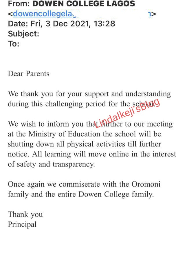 Dowen College has now sent another message to parents and students following the announcement by the Lagos State Government that the school will remain shut indefinitely.