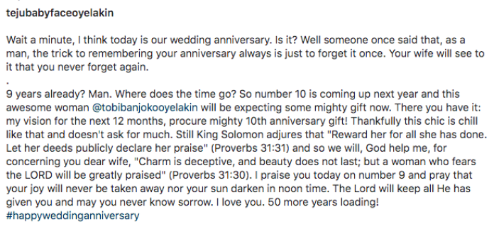 He then went on to wonder where the time has flown to and his wife’s expectation of him. “9 years already? Man. Where does the time go? So number 10 is coming up next year and this awesome woman @tobibanjokooyelakin will be expecting some mighty gift now. There you have it: my vision for the next 12 months, procure mighty 10th anniversary gift! Thankfully this chic is chill like that and doesn’t ask for much”, he added.