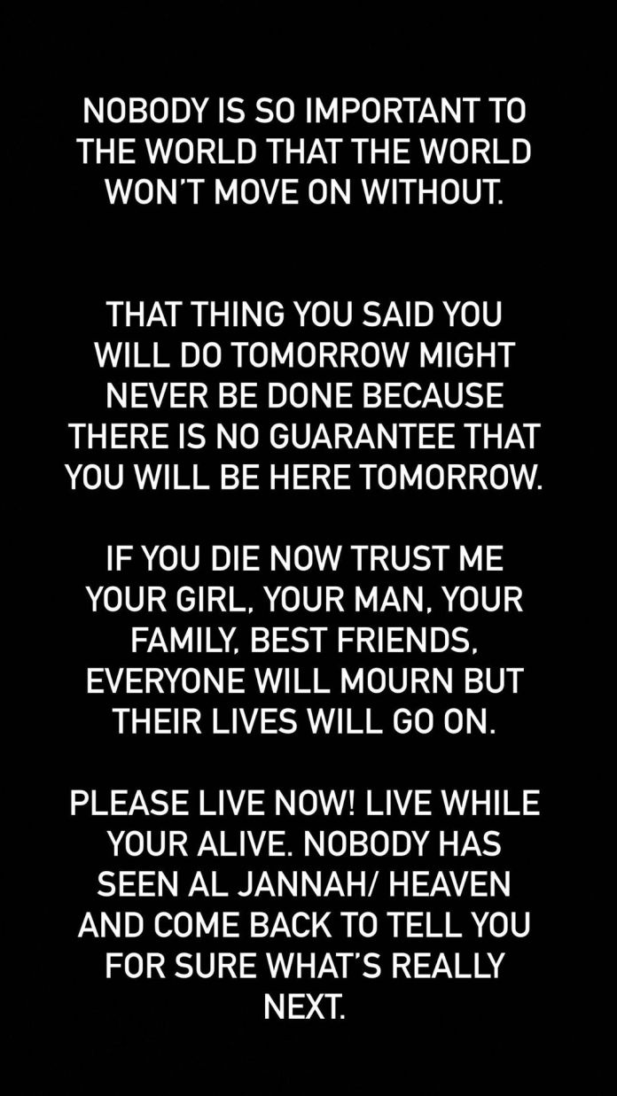 Burna Boy also, deeply noted that “nobody is so important to the world that the world won’t move on without them”.