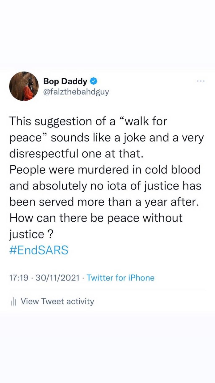 Rapper Folarin Falana, who is better known by his stage name Falz, has described Lagos Governor Babajide Sanwo-Olu’s latest peace move as a “disrespectful joke.”