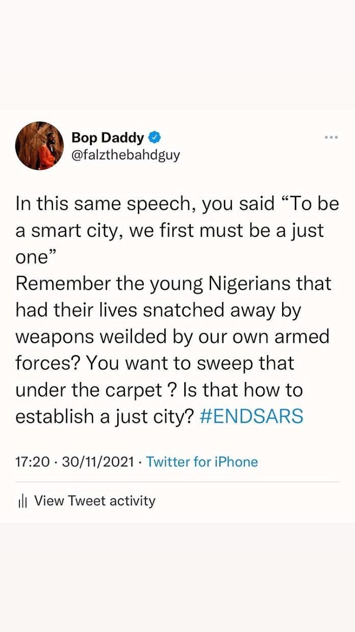 “In this same speech, you said ‘to be a smart city, we must first be a just one.’ Remember the young Nigerians that had their lives snatched away by weapons wielded by our own armed forces?